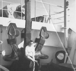 Wir hatten auf diesem Schiff ein echtes Schweizerführungs-quartett; Der Kapitän,. (Walliser französicher Teil) der erste Maschinenoffizier (Schweizer), der Funker, (Berner) – er sprach noch den sehr gemütlichen, breiten und langsamen Bärnerdialekt, und eben der Chefsteward (Tessiner, und ich als erster Koch.(ebenfalls Schweier). Unser Bäcker und Kondiotor, (Welschschweizer und auch der angenehmste hier in der Küche.) Seine Arbeitskleider fertigte er mit den leeren Mehlsäcken an. Die kamen damals noch wirklich mit gutem Stoff gefertigt angeliefert. Der zweite Steward, (Lausanne) der Offiziersmesse und deren Kabinen besorgte und damit voll mit Arbeit ausgelastet war, der dritte Steward,(Italiener mitSchweizerpass) also unser Messboy machte vor allem Reinigungsarbeiten und half noch etwas in der Küche mit. Alle haben eben erst auf diesem Schiff angemustert und waren somit neu, wie ich – und unerfahren.